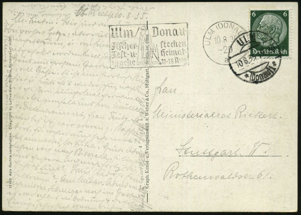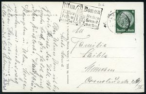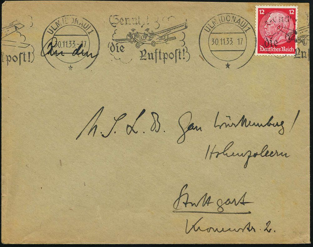 5863 | 18 € | 7900 ULM : ULM (DONAU) 1/ */ Benutzt/ die/ Luftpost! 1933 (30.11.) Band-MaWSt mit 2 verschiedenen Flugzeugen , Fernbf. (Bo.S 71 K 72) | ![]() | |