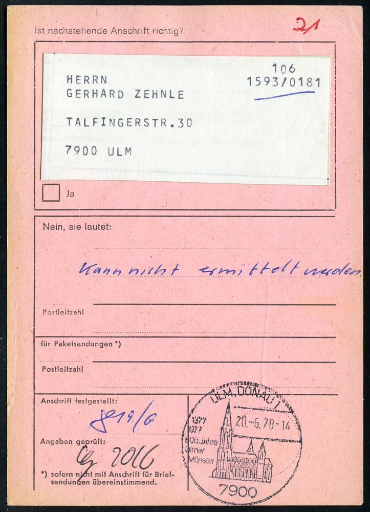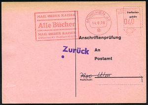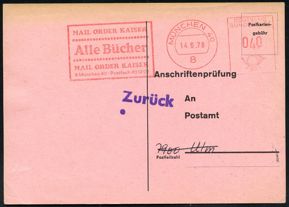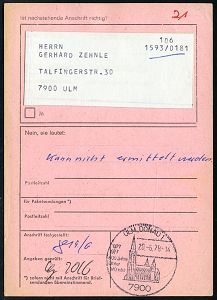 5874 | 25 € | 7900 ULM : 7900 ULM (DONAU) 1/ 800 Jahre/ Ulmer/ Münster 1978 (20.6.) HWSt (Ulmer Münster) rs. auf frankierter Anschriften-Prüfungs-Kt. mit viol. 1L: Zurück, AFS: 6 MÜNCHEN 40/ MAIL ODER KAISER mit 040 Pf. = seltene Verwendung! (Bo.80) | ![]() ![]() | |
