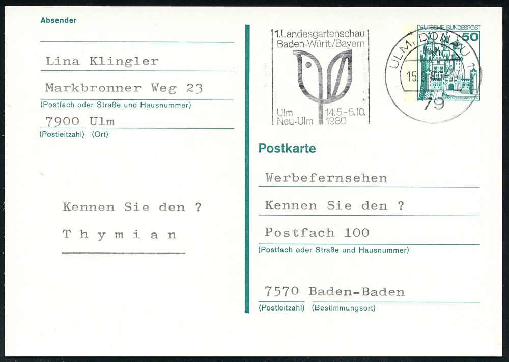 5875 | 6 € | 7900 ULM : 79 ULM,DONAU 1/ mh/ 1.Landesgartenschau.. 1980 (18.8.) MWSt (Pflanzensymbol) Bedarfs-Kt. | ![]() | |