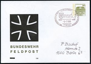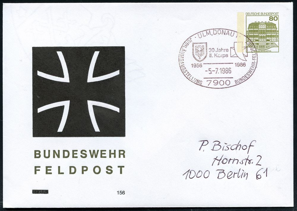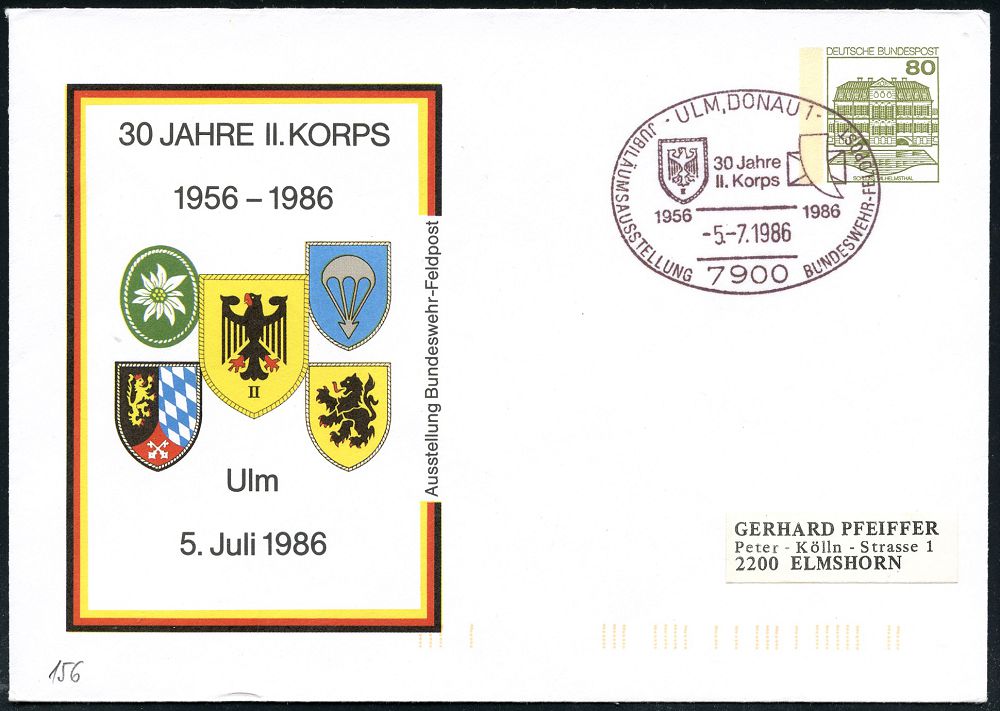 5877 | 10 € | 7900 ULM : 7900 ULM,DONAU 1/ 30 Jahre/ II.Korps/ JUBILÄUMSAUSSTELLUNG.. 1986 (5.7.) SSt (Wappen) auf passender PU 80 Pf. Burgen, oliv: BUNDESWEHR-FELDPOST (Mi.PU 117) | ![]() | |