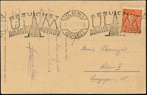 5856 | 18 € | 7900 ULM : ULM Nr.1/ (DONAU)/ BESUCHET/ ULM/ DIE EHR-WÜRDIGE/ MÜNSTER-STADT 1922 (16.9.) Band-MWSt = Silhouette Münster klar auf motivgl. Ausl.-Ak.: Ulmer Münster n. Wien = Inl.-Tarif! (Bo.2 Bd , Erstjahr) | ![]() ![]() | |