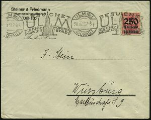 5857 | 15 € | 7900 ULM : ULM Nr.1/ (DONAU)/ BESUCHET/ ULM/ DIE EHR-WÜRDIGE/ MÜNSTER-STADT 1923 (26.9.) Band-MWSt = Ulmer Münster klar auf EF 250 T./500 Mk. (Mi.295 EF) Firmen-Bf.: Steiner & Friedmann KG (Bo.2 Bd) | ![]() | |