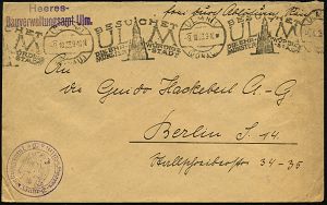 5858 | 18 € | 7900 ULM : ULM/ (DONAU)/ BESUCHET/ ULM.. 1923 (9.10.) Band-MWSt = Ulmer Münster + viol. 2L: Heeres-/ Bauverwaltungsamt Ulm + viol. 2K-HdN (Weimarer Adler) + hs. "frei durch Ablösung Reich", Hochinflations-Dienstbf. n. Berlin (Bo.2 Bd) | ![]() | |