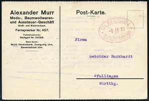 5879 | 25 € | 7900 ULM : ULM (DONAU) 1/ **/ Gebühr bezahlt 1923 (2.IX.) Oval-PFS ohne Steg bzw. Brücke = Hochinflation = 30.000.- Mk. auf Infla-Firmen-Kt.: Alexander Murr, Mode-, Baumwollwaren- u. Aussteuer-Geschäft n. Pfullingen (Dü.A-5, Nr.15 a) | ![]() | |