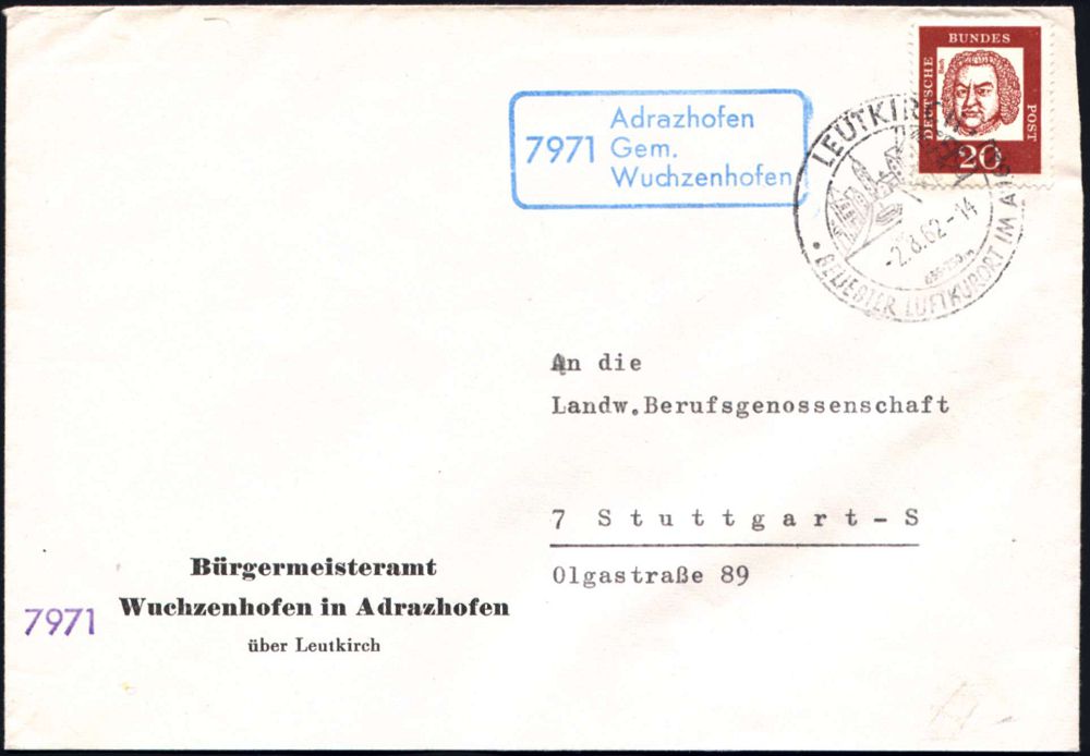 5912 | 14 € | POSTLEITRAUM 7900 (OHNE ULM) : 7971 Adrazhofen/ Gem./ Wuchzenhofen 1962 (2.8.) blauer Ra.3 = PSt.II, dreizeilige Type! + aptierter HWSt: LEUTKIRCH / ..LUFTKURORT = alte PLGZ entfernt! , Dienst-Bf.: Bürgermeisteramt Wuchzenhofen.. + zugestempelte neue PLZ: 7971 (Bo.2 apt.) | ![]() | |
