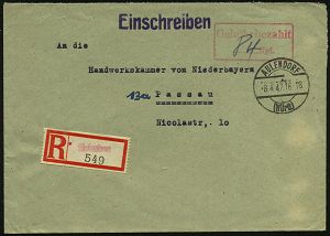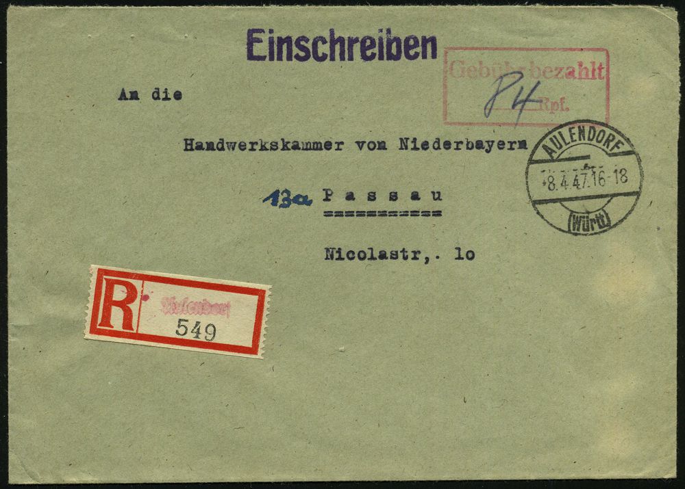 5914 | 15 € | POSTLEITRAUM 7900 (OHNE ULM) : AULENDORF/ (Württ) 1947 (8.4.) 1K-Brücke + roter Ra.2: Gebühr bezahlt/____Rpf. (hs. "84" Rpf) + provis. RZ: Aulendorf (roter 1L a. Blanco-RZ), Inl.-R-Bf. n. Passau (Richter Nr.2515) | ![]() | |