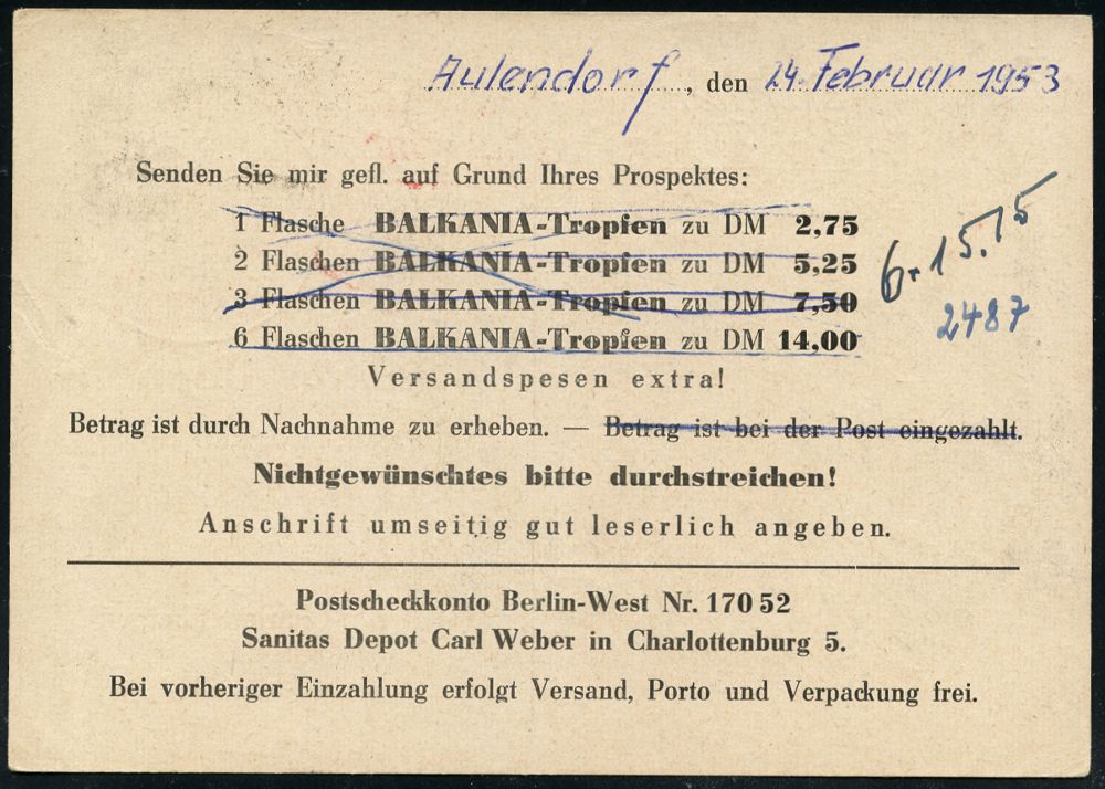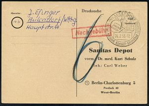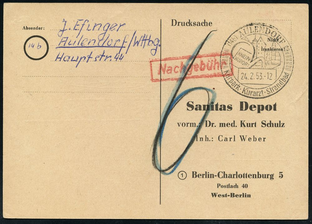 5916 | 14 € | POSTLEITRAUM 7900 (OHNE ULM) : (14b) AULENDORF/ KNEIPP/ KURORT.. 1953 (24.2.) HWSt = Kneipp-Kanne (vor Ort) + Ra.: Nachgebühr , unfrankierte Werbe-Antwort-Nachgebühr-Kt. (hs. 6 Pf.) n. West-Berlin (Bo.1) | ![]() ![]() | |