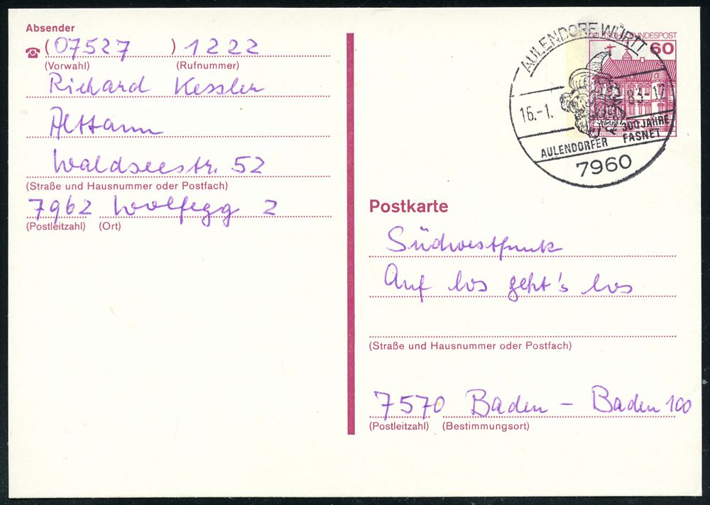 5918 | 6 € | POSTLEITRAUM 7900 (OHNE ULM) : 7960 AULENDORF,WÜRTT/ 300 JAHRE/ AUSLENDORFER FASNET 1983 (16.1.) HWSt (Hexe) Bedarfs-Kt. | ![]() | |