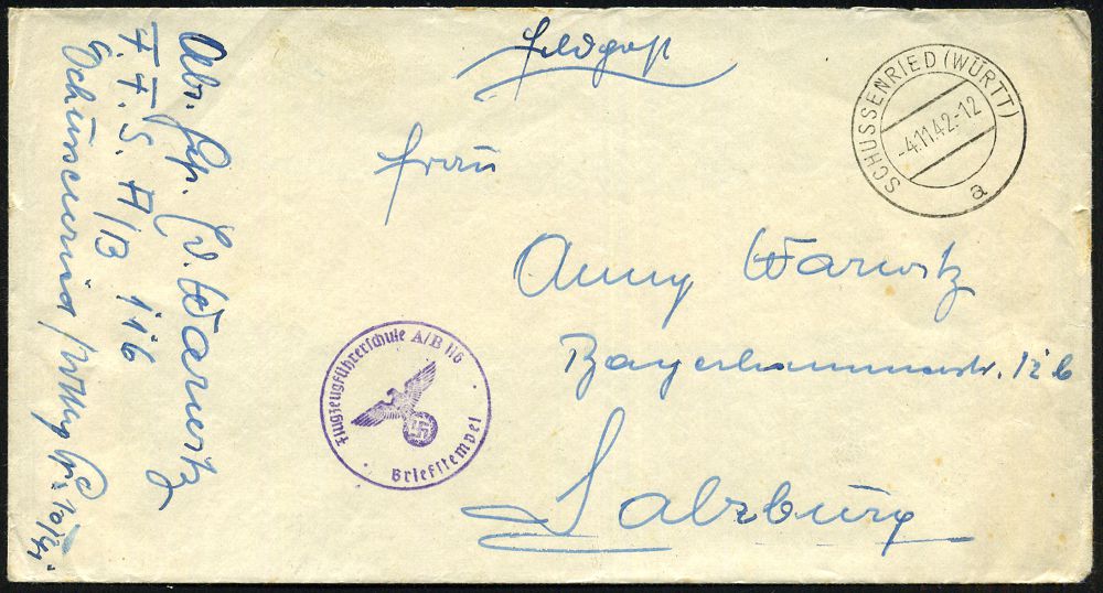 6123 | 14 € | POSTLEITRAUM 7900 (OHNE ULM) : SCHUSSENRIED (WÜRTT)/ a 1942 (4.11.) 2K-Steg + viol. 1K-HdN: Flugzeugführerschule A/B 116 + vs. hs. Abs., Luftwaffen-Feldpost-Bf. n. Salzburg | ![]() | |