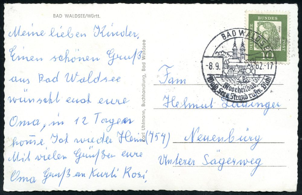 5919 | 12 € | POSTLEITRAUM 7900 (OHNE ULM) : BAD WALDSEE/ Moorheilbad.. 1962 (8.9.) aptierter HWSt = PLGZ entfernt (Ort mit Kirche) motiv-ähnl. s/w.-Foto-Ak.: Bad Waldsee (Bo.4 aptiert) | ![]() ![]() | |