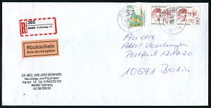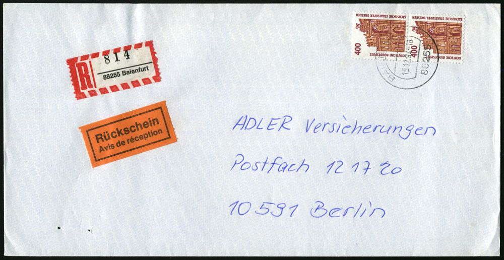 6127 | 14 € | POSTLEITRAUM 7900 (OHNE ULM) : 88069 TETTNANG 11/ b 1994 (6.10.) 1K-Segment 2x auf 800 Pf.-Frankatur + Selbstklebe-RU: 88099 Tettnang 11 , sauber gest. Fern-R-Bf. "Rückschein" = seltene Portostufe! (Mi.2x 1393 u.a.) | ![]() | |