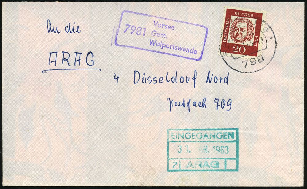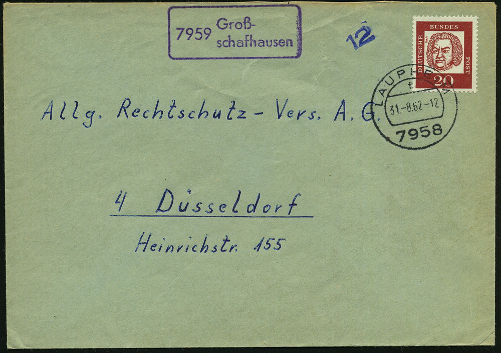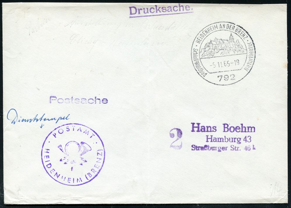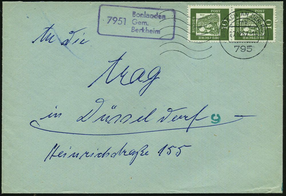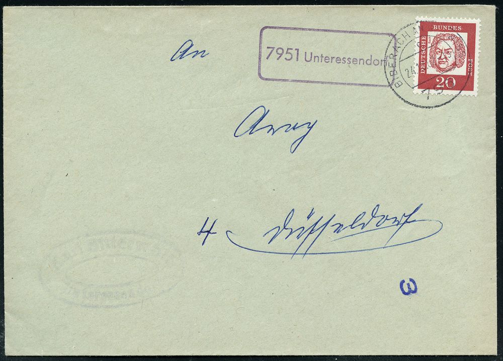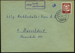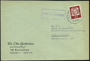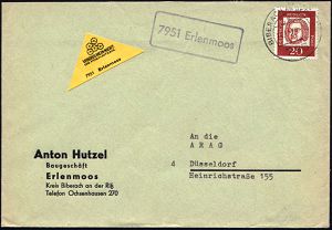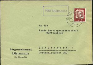 5953 | 12 € | POSTLEITRAUM 7900 (OHNE ULM) : 7951 Dietmanns 1962 (6.10.) viol. Ra. = PSt.II + 1K-Segment: 795 BIBDERACH AN DER RISS/e , klar auf Dienst-Bf.: Bürgermeisteramt Dietmanns | ![]() | |