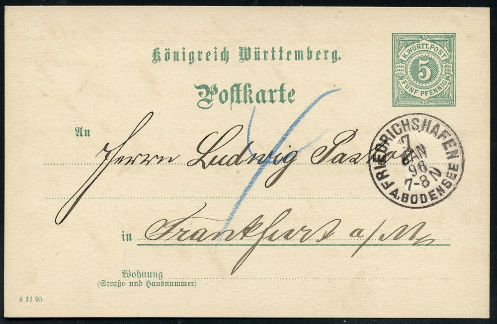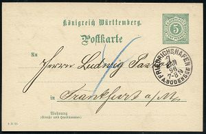 5958 | 20 € | POSTLEITRAUM 7900 (OHNE ULM) : FRIEDRICHSHAFEN/ A.BODENSEE 1896 (7.1.) 1K neben Wertstempel , Inl.-P 5 Pf. Ziffer, grün = Rückgabe am Schalter für 4 Pf. , da verschrieben! (hs. "4") seltene Verwendung! (Mi.P 37) | ![]() | |