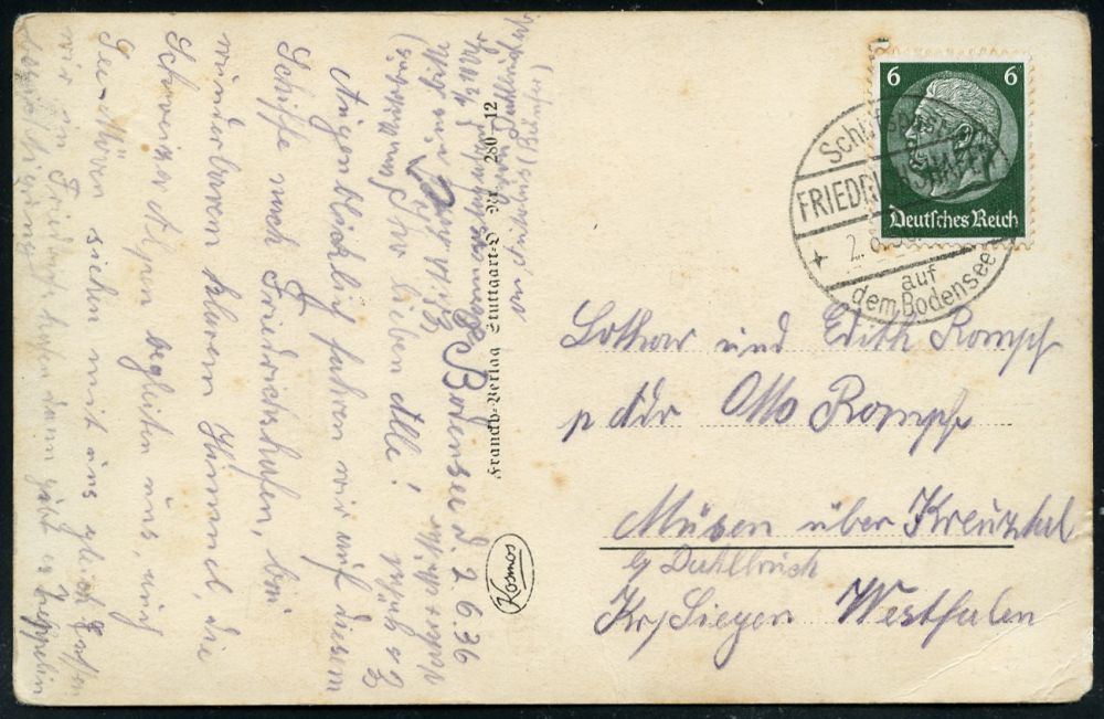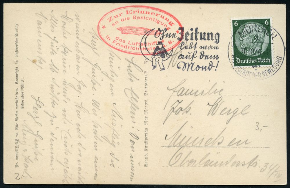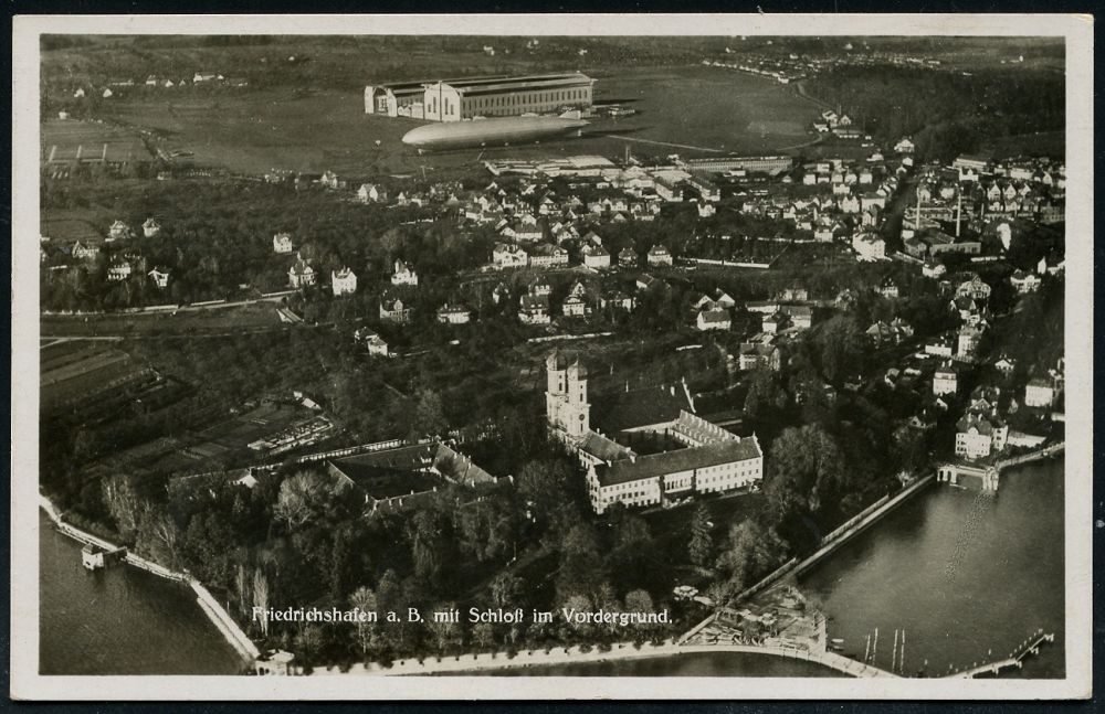 5963 | 15 € | POSTLEITRAUM 7900 (OHNE ULM) : Friedrichshafen 1936 (16.10.) s/w.-Foto-Ak.: Luftbild Friedrichshafen mit Schloß, Luftschiffhalle u. Zeppelin , roter HdN: Zur Erinnerung/an die Besichtigung/des Luftschiffs.. (Zeppelin) Aufgabe in München, Bedarf | ![]() ![]() | |