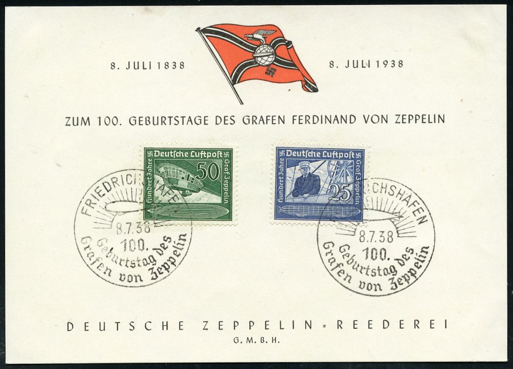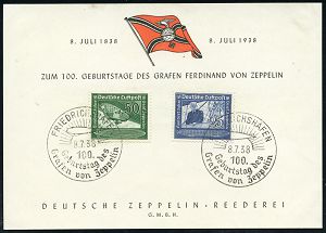 5966 | 20 € | POSTLEITRAUM 7900 (OHNE ULM) : FRIEDRICHSHAFEN/ 100./ Geburtstag des/ Grafen v.Zeppelin 1938 (8.7.) SSt auf kompl. Satz Zeppelin (Mi.669/70) dekoratives Gedenkblatt Zeppelin-Reederei ! (Bo.4) | ![]() | |