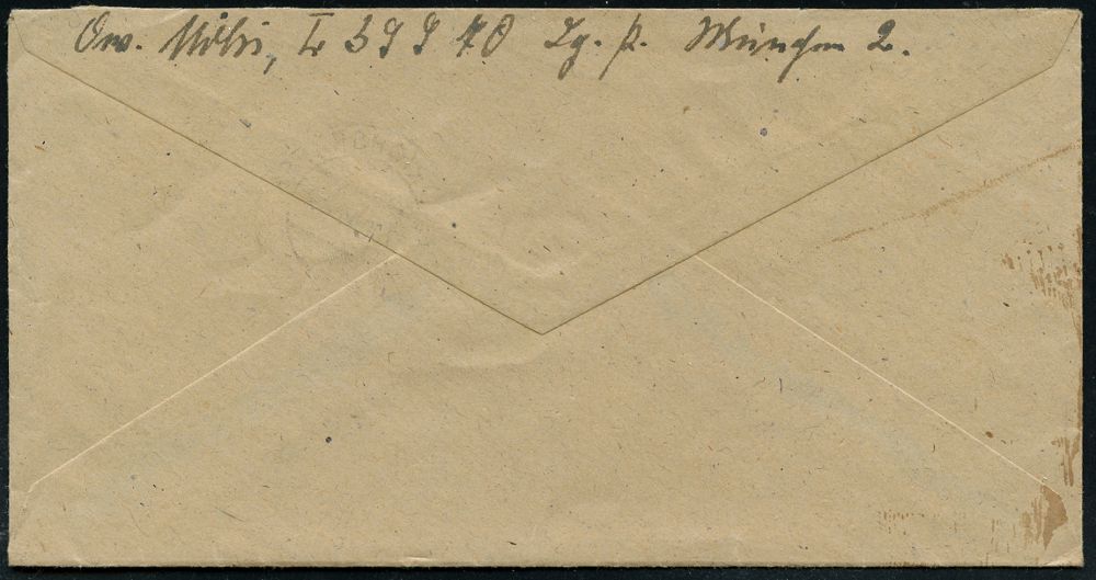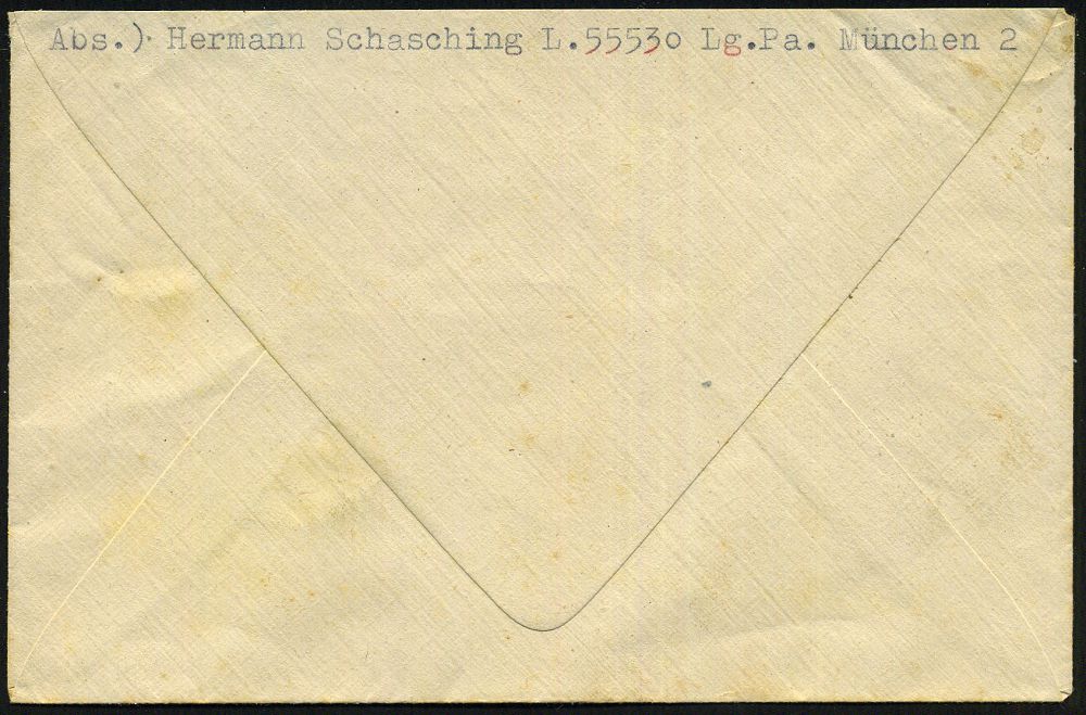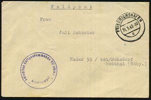 5970 | 15 € | POSTLEITRAUM 7900 (OHNE ULM) : FRIEDRICHSHAFEN/ c 1943 (31.5.) 2K-Steg + aptierter 1K-HdN: Schießstab Luftgaukommando VII (schw.) + rs. Abs.: Feldpostnr. L 55 530 = 6. Battr. schwere Flak Abt. 571 (LGPA München) kleiner, klar gest. Feldpost-Bf. n. Ruhstorf-Hader | ![]() ![]() | |