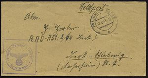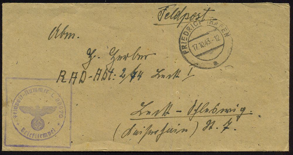 5971 | 12 € | POSTLEITRAUM 7900 (OHNE ULM) : FRIEDRICHSHAFEN/ a 1943 (17.10.) 2K-Steg + viol. Ra: Feldpost-Nummer L 39970 = leichte Flak-Abt. 932 + rs. hs. Abs., kleiner Feldpost-Bf. an R.A.D.-Abt. 2/74 | ![]() ![]() | |