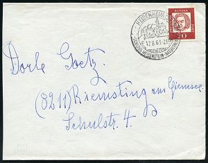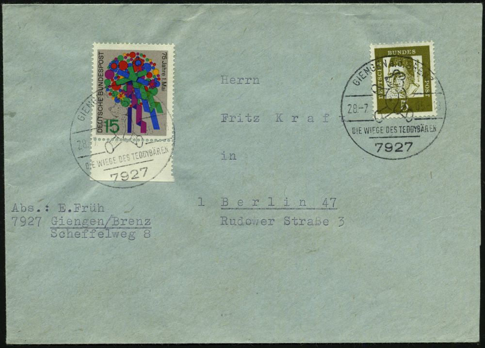 6009 | 12 € | POSTLEITRAUM 7900 (OHNE ULM) : 7927 GIENGEN a.d.BRENZ/ DIE WIEGE DES TEDDYBÄREN 1965 (28.7.) HWSt = Teddy-Bär 2x klar auf Inl.-Bf. (Bo.3) | ![]() | |