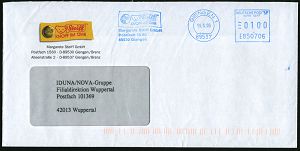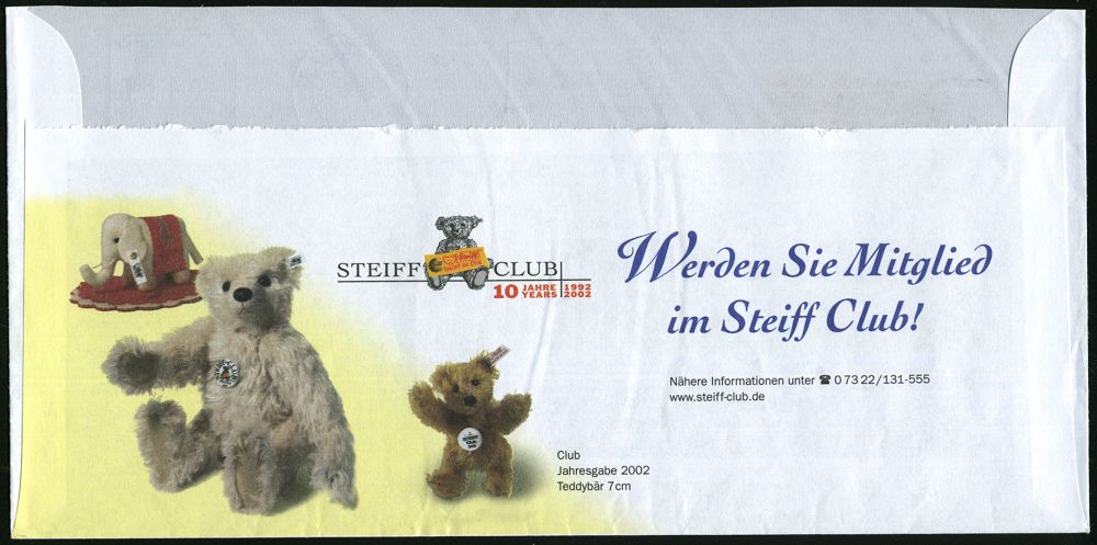 6014 | 12 € | POSTLEITRAUM 7900 (OHNE ULM) : 89537 GIENGEN 1/ E850706/ Steiff/ KNOPF IM OHR/ Margarete Steiff GmbH.. 2003 (15.5.) blauer AFS Pitney-Bowes = Teddybärkopf (Firmen-Logo) motivgl. Firmenbf., rs. Teddybär-Reklame! | ![]() ![]() | |