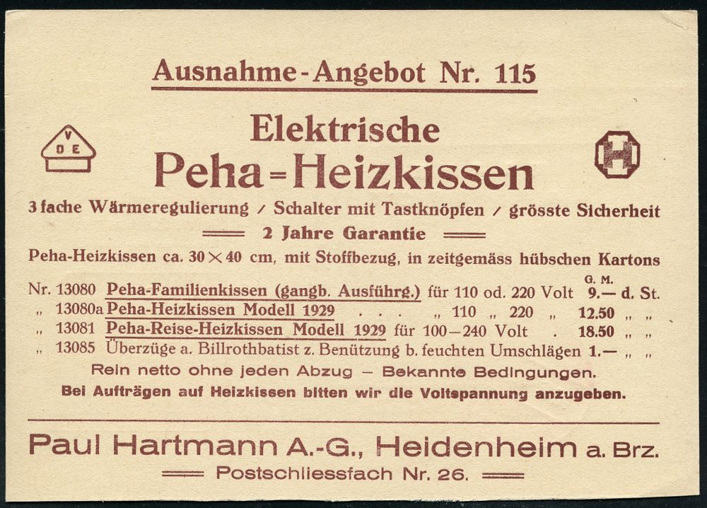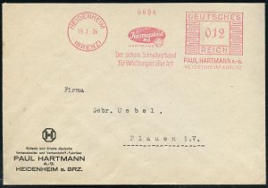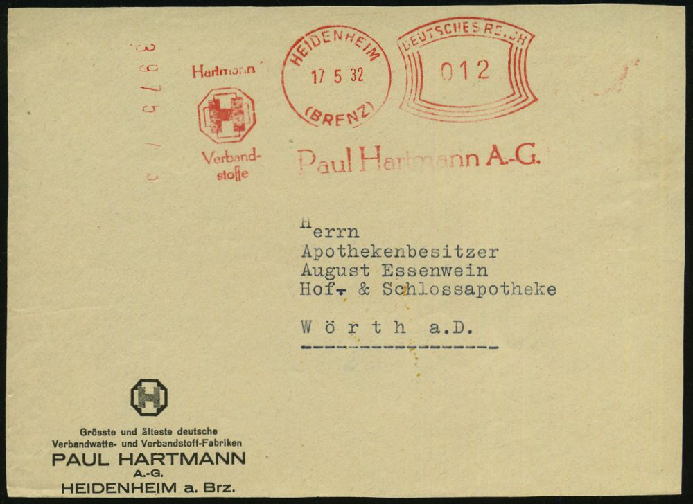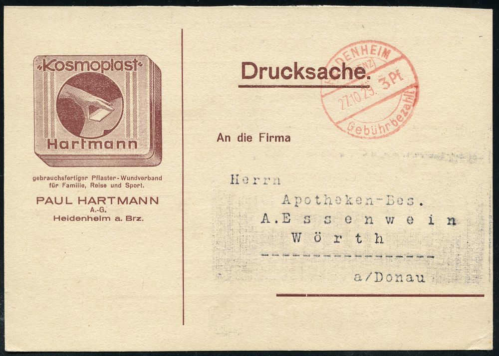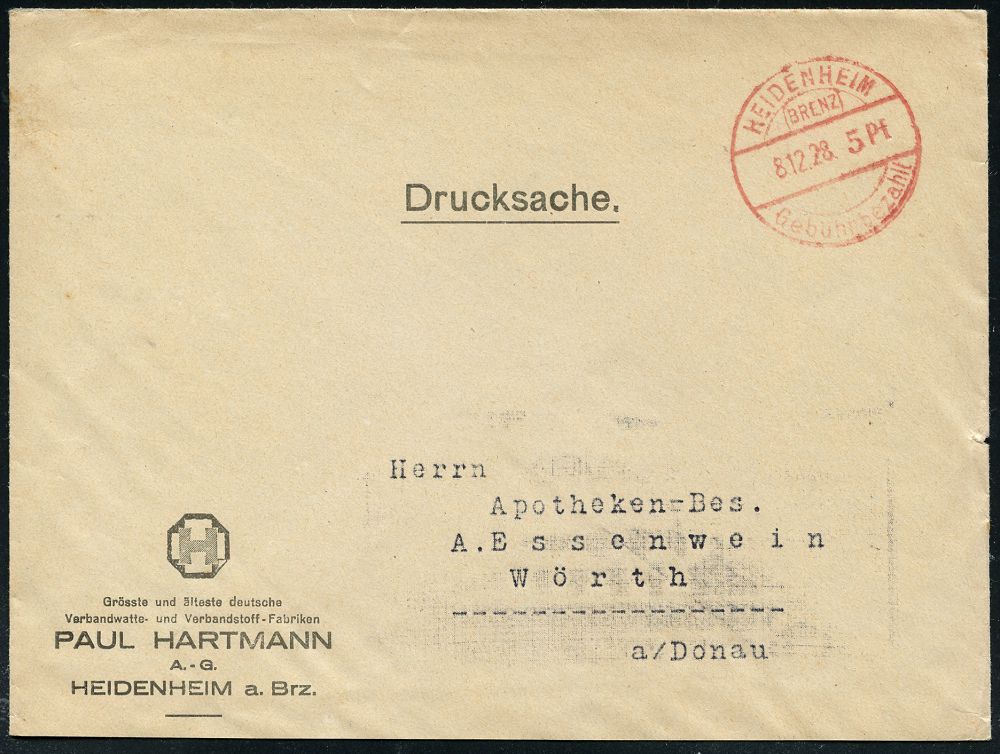 6018 | 14 € | POSTLEITRAUM 7900 (OHNE ULM) : HEIDENHEIM/ (BRENZ)/ Gebühr bezahlt 1928 (8.12.) 1K-Brücken-PFS 5 Pf. auf Firmen-Bf.: ..Verbandswatte u. Verbandsstoff-Fabriken PAUL HARTMANN.. (Firmenlogo) (Dü.A-6, Nr.25) | ![]() | |