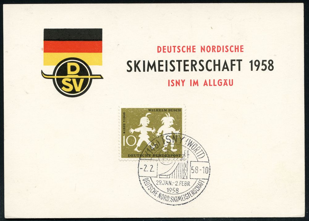 6059 | 15 € | POSTLEITRAUM 7900 (OHNE ULM) : (14b) ISNY (WÜRTT)/ DSV/ DEUTSCHE NORD.SKIMEISTERSCHAFT 1958 (2.2.) SSt. (Sprungschanze) klar gest. Inl.-Flp.-Karte (EF Bln 178 EF+ 6.- EUR) klar gest.! (Bo.6) | ![]() | |