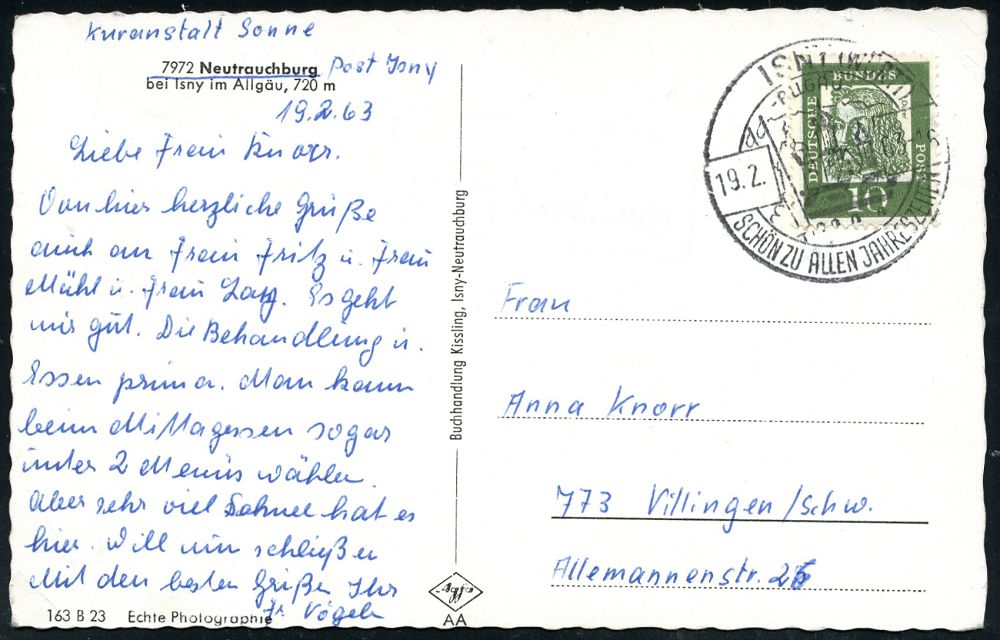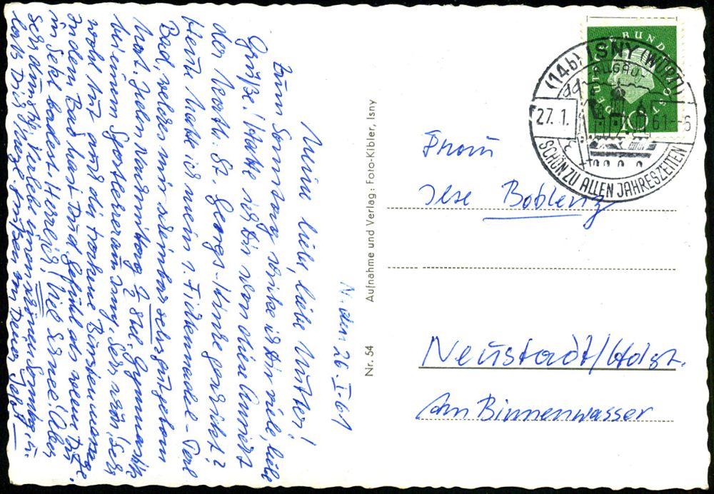 6062 | 14 € | POSTLEITRAUM 7900 (OHNE ULM) : (14b) ISNY (WÜRTT)/ SCHÖN ZU ALLEN JAHRESZEITEN 1963 (19.2.) aptierter HWSt = alte PLGZ entfernt (Skistöcke, Kirche St. Georg) s/w.-Foto-Ak.: Neutrauchburg, Bedarf (Bo.7 aptiert) | ![]() ![]() | |