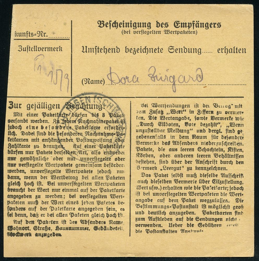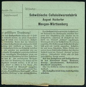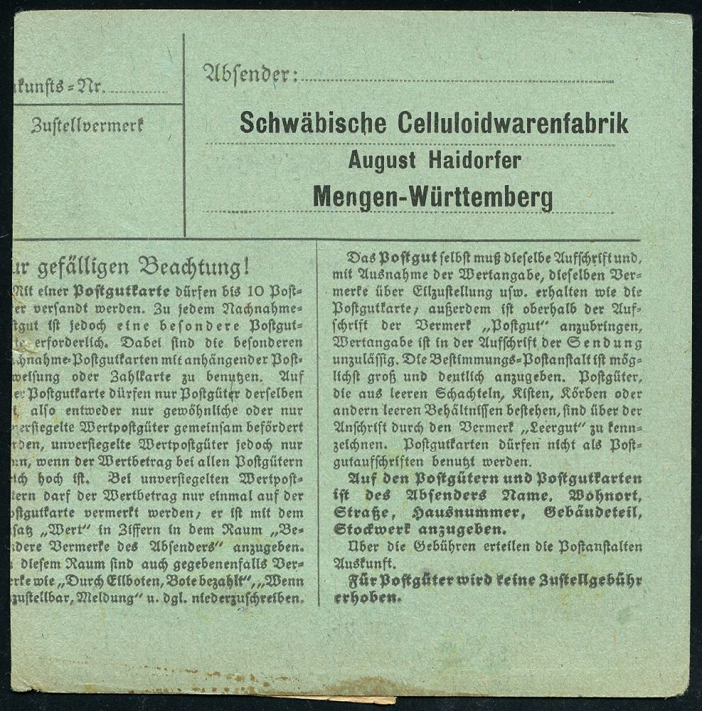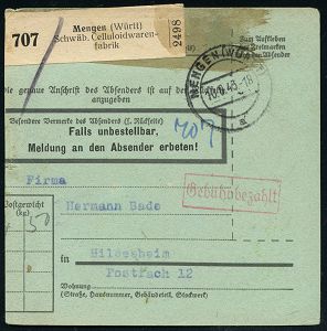 6075 | 20 € | POSTLEITRAUM 7900 (OHNE ULM) : MENGEN (WÜRTT)/ a 1943 (10.8.) 2K-Steg + roter Ra: Gebühr bezahlt + Selbstbucher-Paketzettel: Mengen (Württ)/ Schwäb. Celluloidwaren-/fabrik (Leimfleck) grüne Inl-Selbstbucher-Paketgut-Kt. n Selbstbucher-Paketgut-Kt.! | ![]() ![]() | |