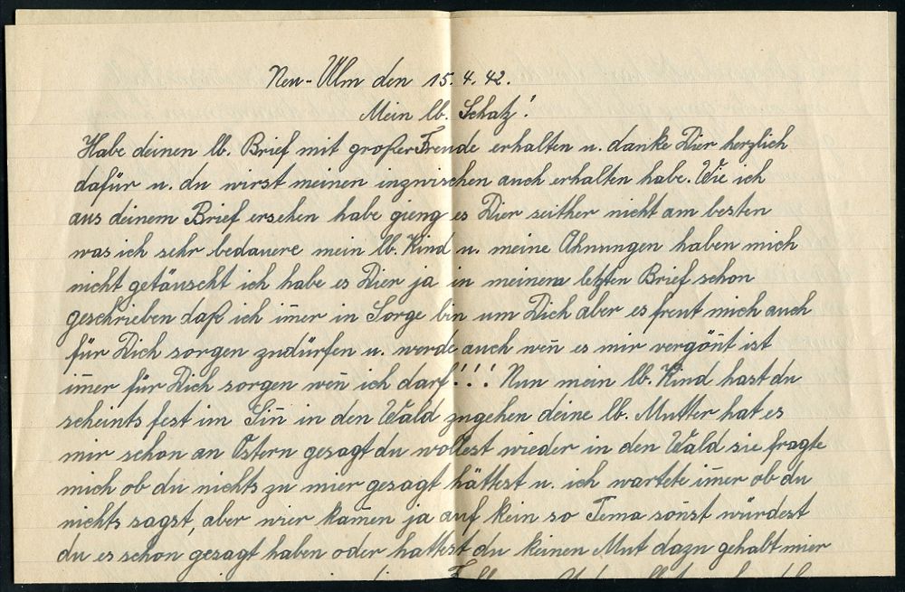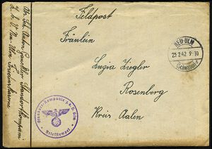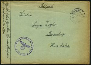 6081 | 18 € | POSTLEITRAUM 7900 (OHNE ULM) : NEU-ULM/ (Schwaben)/ a 1942 (25.2./17.4.) 1K-Brücke + seltener, viol. 1K-HdN: Standort-Kompanie z.(ur) b.(esonderen) V.(erwendung) Ulm , je auf Feldpost-Bf. + je Inhalt (beide etw. randfleckig) n. Rosenberg, 2 Belege | ![]() ![]() ![]() | |