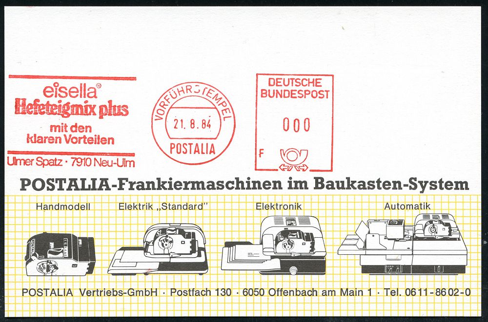 6091 | 18 € | POSTLEITRAUM 7900 (OHNE ULM) : 7910 Neu-Ulm 1984 (21.8.) AFS: VORFÜHRSTEMPEL/POSTALIA/F/eisella/Hefeteigmix plus../Ulmer Spatz , seltene Postalia- Musterkt. (= Specimen) | ![]() | |