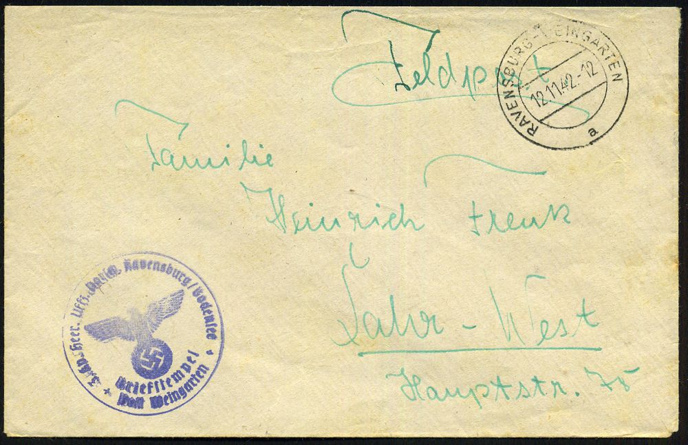 6097 | 14 € | POSTLEITRAUM 7900 (OHNE ULM) : RAVENBURG-WEINGARTEN/ a 1942 (12.11.) 2K-Steg + viol. 1K-HdN: 3. Kp. Heer. Uffz. Vorsch.(ule). Ravensburg-Bodensee/Post Weingarten, existierte nur von Okt. 1942 - 1944 , Feldpost-Bf. (rs. etw. fleckig) n. Lahr | ![]() | |