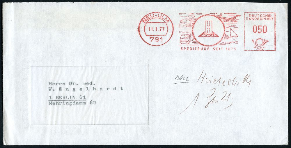 6088 | 10 € | POSTLEITRAUM 7900 (OHNE ULM) : 791 NEU-ULM/ HONOLD/ SPEDITEUR SEIT 1879 1977 (11.1.) AFS Francotyp (Monogr.-Logo, E-Lok, LKW, Flugzeug, Schiff) rs. Reklame-Text u. Landkarte n. West-Berlin (Dü.E-23) | ![]() ![]() | |