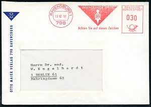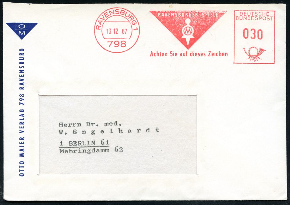 6105 | 12 € | POSTLEITRAUM 7900 (OHNE ULM) : 798 RAVENSBURG 1/ RAVENSBURGER SPIELE.. 1967 (13.12.) AFS Francotyp (Logo: Spielstein = Brettspiel-Hersteller etc.) Firmen-Bf: Otto Maier-Verlag (E-23) | ![]() | |