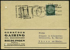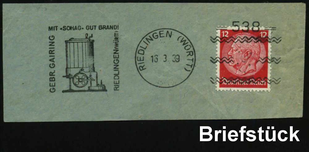 6110 | 18 € | POSTLEITRAUM 7900 (OHNE ULM) : RIEDLINGEN (WÜRTT)/ =538=/ GEBR.GAIRING/ MIT "SCHAG"-GUT BRAND! 1939 (16.3.) Freimarkenstempel auf 12 Pf. Hindenbg. = Frankier- u. Stempelapparat der Fa. "Telefonbau & Normalzeit" zur Vorausentwertung! (Destillier-App.) klar gest. Briefstück, Handbuch nachgemeldet!, selten! (Mi.519) | ![]() | |
