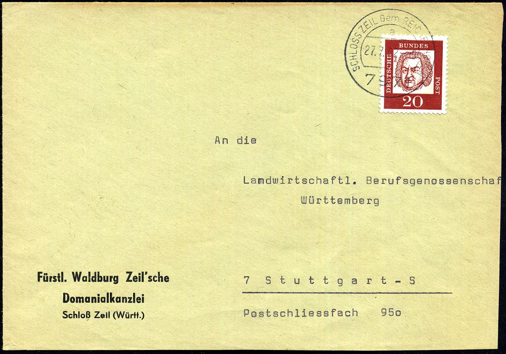 6122 | 16 € | POSTLEITRAUM 7900 (OHNE ULM) : 7971 S C H L O S S Z E I L Gem.REICHENHOFEN/ a 1962 (27.7.) seltener 1K-Segment = Hauspostamt Fürstl. Waldenburg Zeil´sche Domäne, Schloß Zeil auf passendem Firmen-Bf.: .. Domanialkanzlei Schloß Zeil (Mi.352) | ![]() | |