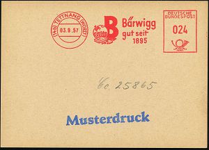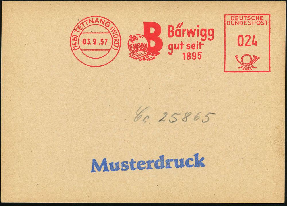 6126 | 25 € | POSTLEITRAUM 7900 (OHNE ULM) : (14b) TETTNANG (WÜRTT)/ B/ Bärwigg/ gut seit/ 1895 1957 (3.9.) AFS Francotyp-Archivmuster (Bonbon-Glas etc.) + bl. 1L: Musterdruck + hs. Maschinen-Nr. Cc 25865, seltene Unikat-Archivmuster-Karte! (Dü.E-23CO) | ![]() ![]() | |