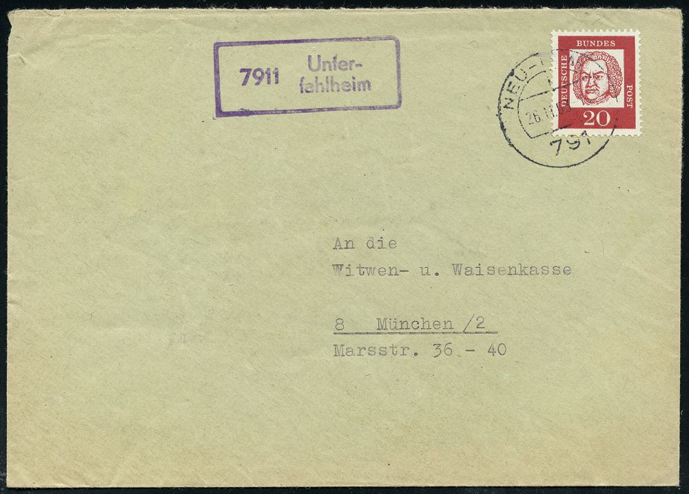 6129 | 12 € | POSTLEITRAUM 7900 (OHNE ULM) : 7911 Unter-/ fahlheim 1963 (26.11.) viol. Ra.2 = PSt.II (zweizeilig) + 1K-Segent: 791 NEU-ULM 1/i , Fern-Bf. (Mi.35 EF) | ![]() | |