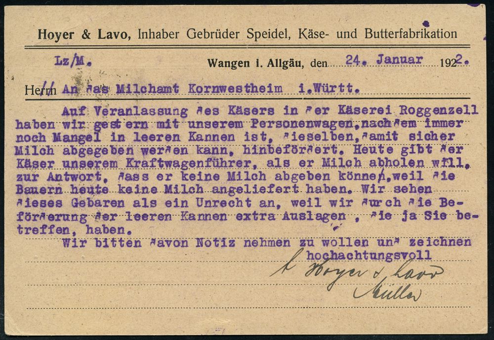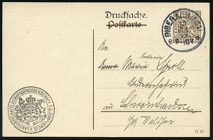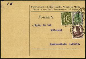 6135 | 18 € | POSTLEITRAUM 7900 (OHNE ULM) : WANGEN IM ALLGÄU 1922 (24.1.) 1K auf Infla-Frankatur 15 Pf. u. 1 Mk. Germania, 10 Pf. Ziffer alle mit Firmenlochung: "G. S." = G ebr. Speidel, = Firma Hoyer & Lavo, Käse- u. Butterfabrik, Firmen-Kt. n. Konwestheim (Mi.101, 150, 159 Perfin) | ![]() ![]() | |