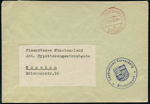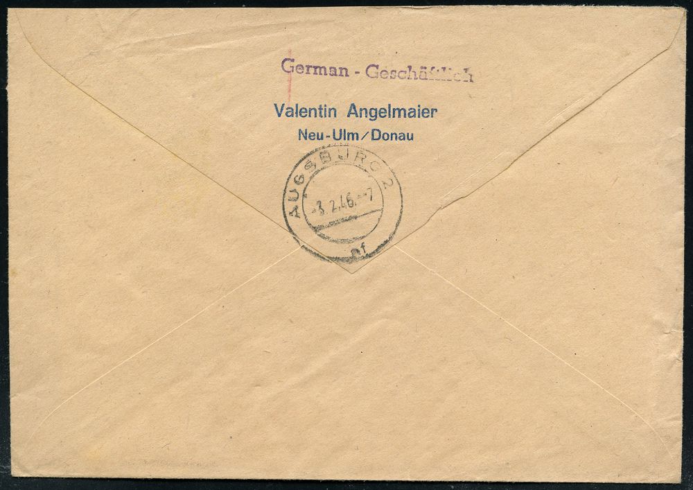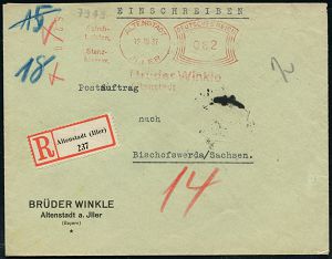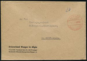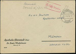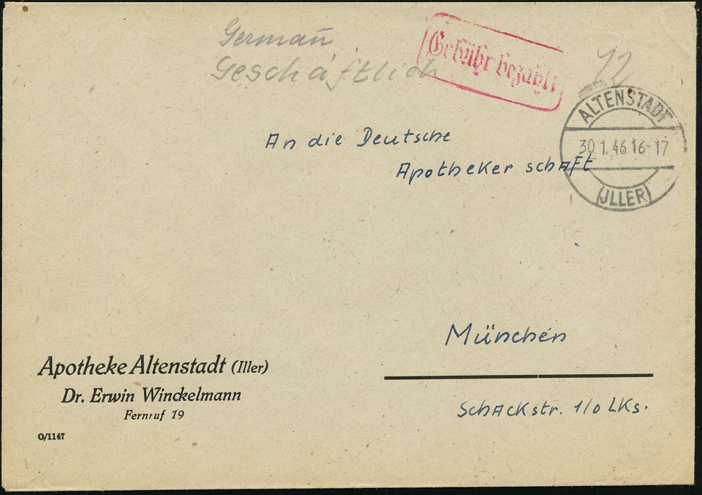 5915 | 12 € | POSTLEITRAUM 7900 (OHNE ULM) : ALTENSTADT/ (JLLER) 1946 (30.1.) 1K-Brücke + roter Ra.: Gebühr bezahlt , Firmen-Bf.: Apotheke Altenstadt.. n. München | ![]() | |
