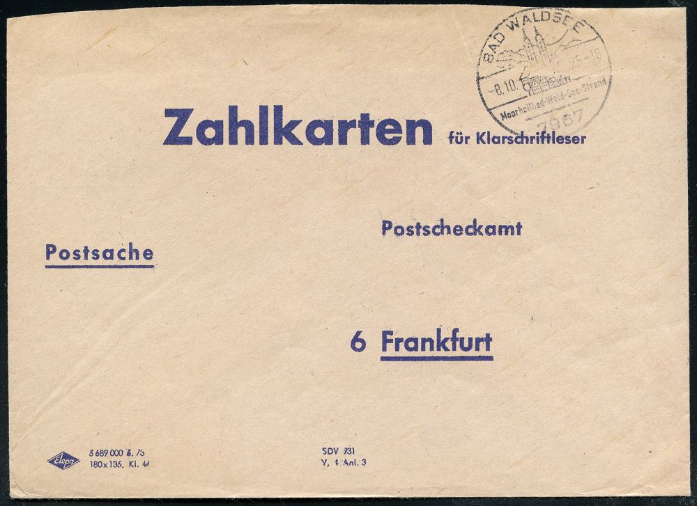 5921 | 16 € | POSTLEITRAUM 7900 (OHNE ULM) : 7967 BAD WALDSEE/ Moorheilbad.. 1975 (8.10.) HWSt (Kloster vor Bergen) auf PSch.-Innendienst-Bf. "Zahlkarten" (weiß/blau) für Zahlkartenaustausch!,, seltene Verwendung! (Bo.5) | ![]() | |