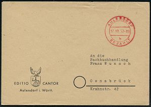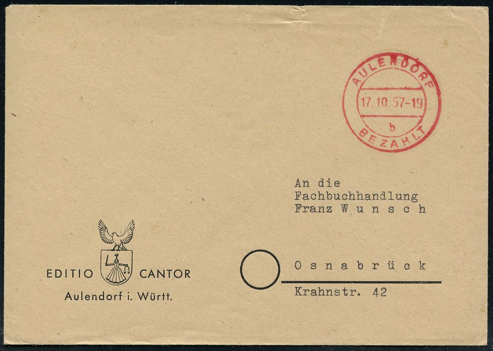 5917 | 10 € | POSTLEITRAUM 7900 (OHNE ULM) : AULENDORF/ b/ BEZAHLT 1957 (17.10.) gr. 2K-Steg-PFS ohne Wertziffer mit Uhrzeit auf illustriertem Firmen-Bf.: EDITIO CANTOR.. (Dü.A-7, Nr.33 b) | ![]() | |