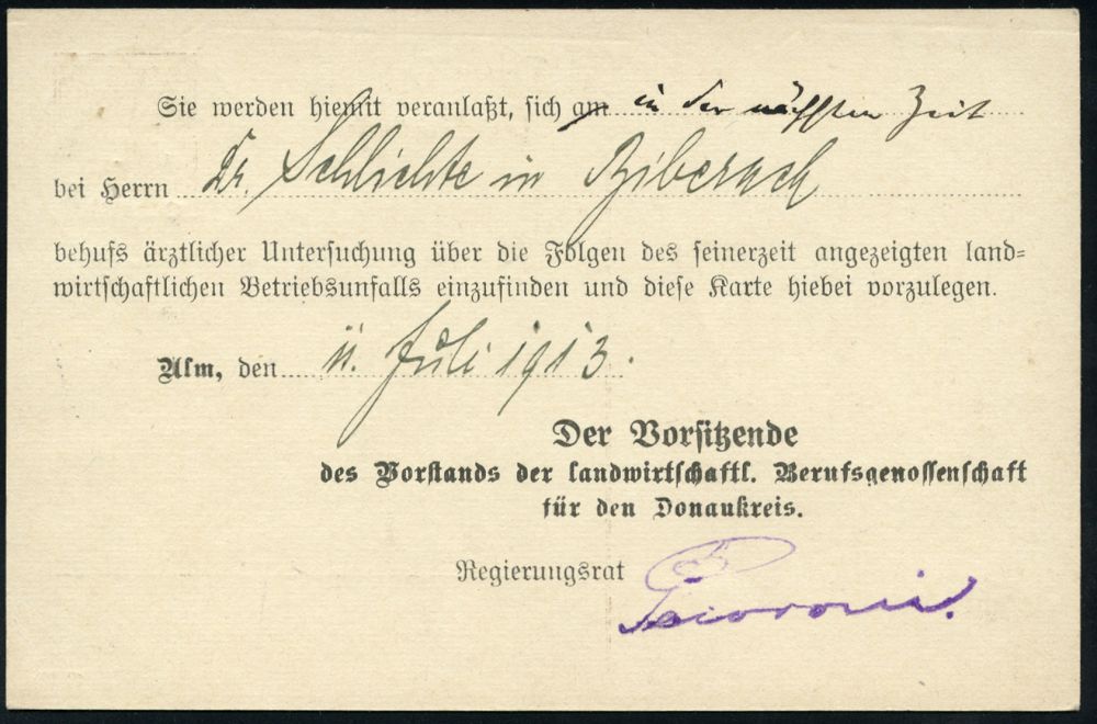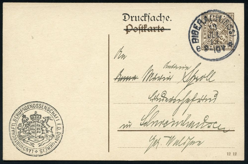5925 | 28 € | POSTLEITRAUM 7900 (OHNE ULM) : BIBERACH (RISS)/ e* 1913 (13.7.) 1K auf Dienst-P 3 Pf. Ziffer, braun: LANDWIRTSCHAFTL. BERUFSGENOSSENSCHAFT F.D. DONAUKREIS (Unfallsache) mit Aufdruck: "Drucksache", rs. Zudruck: ..Betriebsunfall.. (Mi.DP 42/06) | ![]() ![]() | |