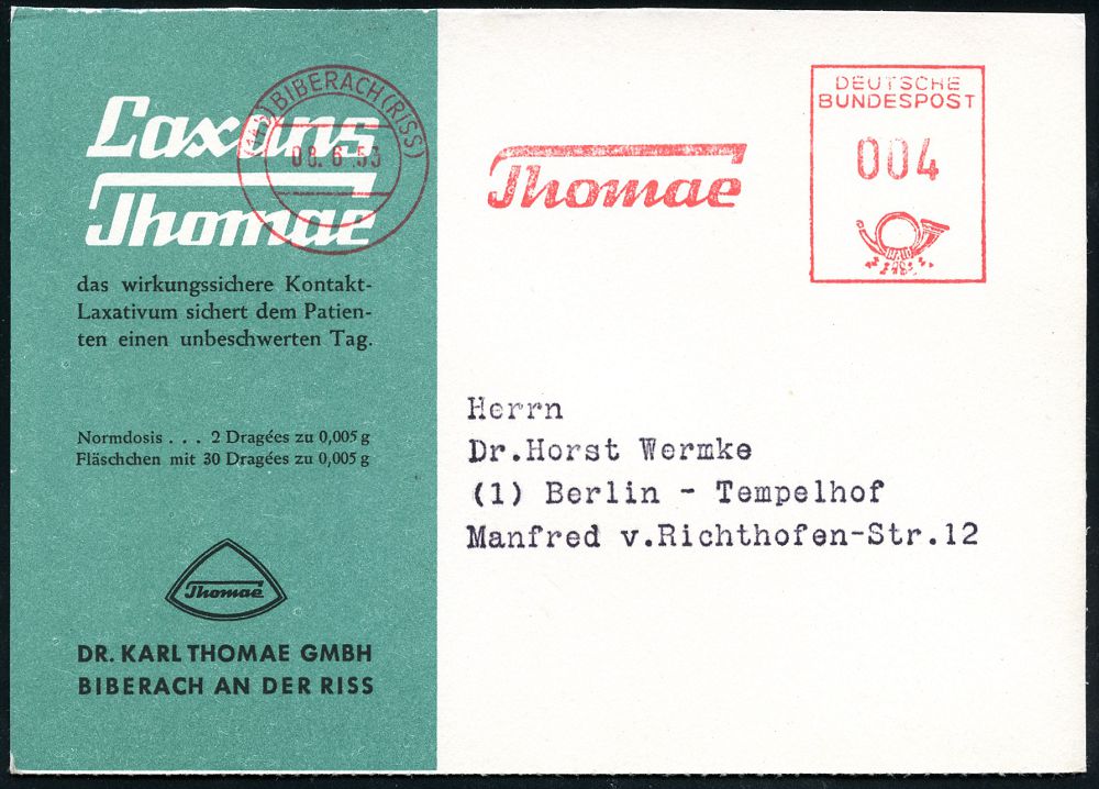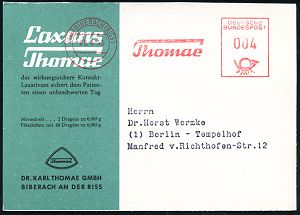 5937 | 15 € | POSTLEITRAUM 7900 (OHNE ULM) : (14b) BIBERACH (RISS)/ Thomae 1953 (Juni) AFS Francotyp auf grüner (halber) Reklame-Kt.: Laxans Thomae.. (Firmen-Logo) Fern-Kt. (Dü.E-23CO) | ![]() ![]() | |