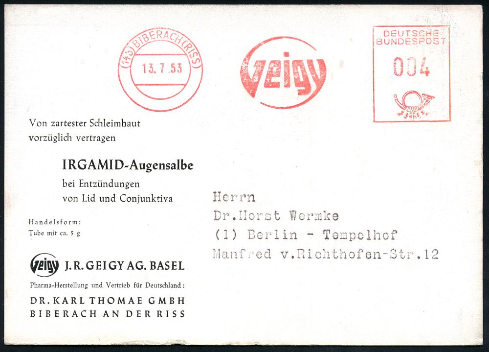 5938 | 16 € | POSTLEITRAUM 7900 (OHNE ULM) : (14b) BIBERACH (RISS)/ Geigy 1953 (13.7.) AFS Francotyp auf Color-Reklame-Kt.: IRGAMID-Augensalbe.. (vergrößertes Auge) Inl.-Kt. (Dü.E-23CO) | ![]() ![]() | |