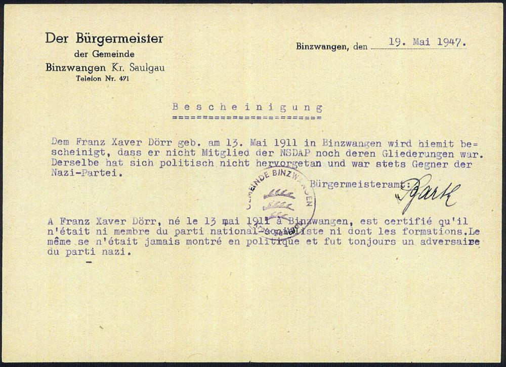 5945 | 25 € | POSTLEITRAUM 7900 (OHNE ULM) : Binzwangen 1947 (19.5.) zweisprachige Entnazifizierungs-Bescheinigung: Der Bürgermeister.. :"..er nicht Mitglied der NSDAP ..war,.. hat sich politisch nicht hervorgetan und war stets Gegner der Nazi-Partei" = sogen. "Persil"-Schein | ![]() | |
