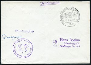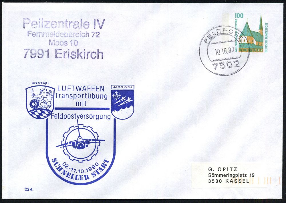 5956 | 15 € | POSTLEITRAUM 7900 (OHNE ULM) : 7991 Eriskirch 1990 (10.10.) 1K-Segment: FELDPOST/7502 + viol. Abs-2L: Peilzentrale IV/Fernmeldebereich 72/..7991 Eriskirch auf PU 100 Pf. Bauwerke: LUFTWAFFEN Transportübung mit Feldpostversorgung "SCHNELLER START" (Mi.PU 290) | ![]() | |