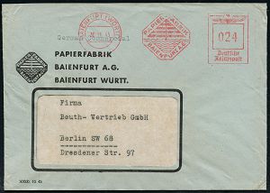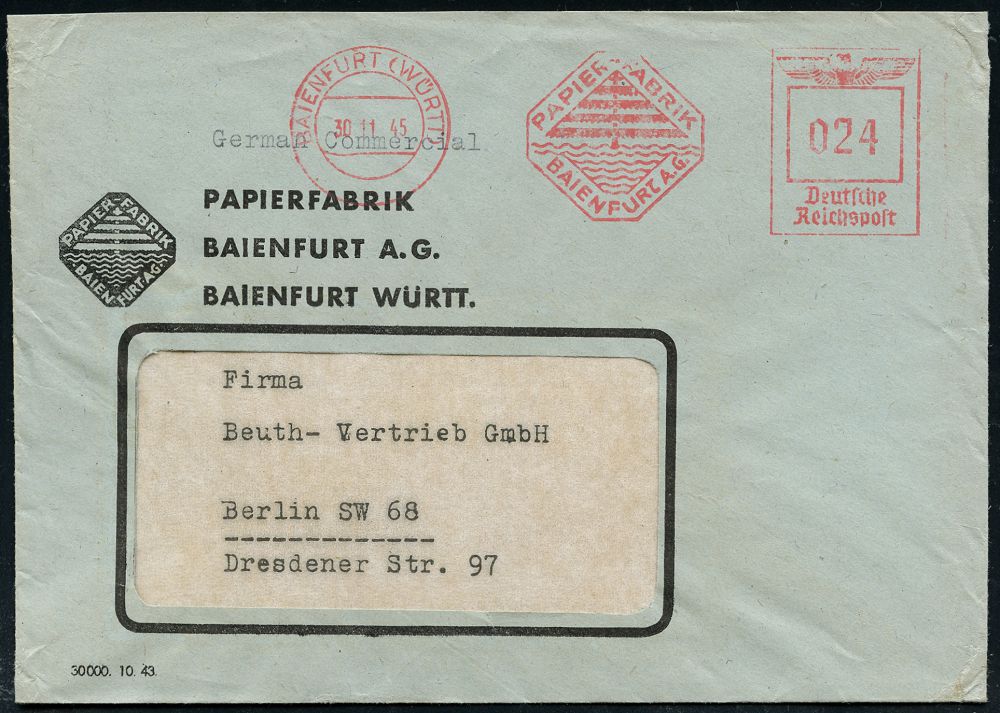 5923 | 28 € | POSTLEITRAUM 7900 (OHNE ULM) : BAIENFURT (WÜRTT)/ PAPIER FABRIK/ BAIENFURT 1945 (30.11.) AFS Francotyp "Reichsadler" u n v e r ä n d e r t weiterverwendet = Notmaßnahme! (Firmen-Logo) motivgl. Firmen-Bf. (Dü.E-5CGo unverändert) | ![]() | |