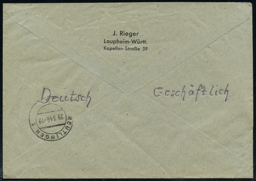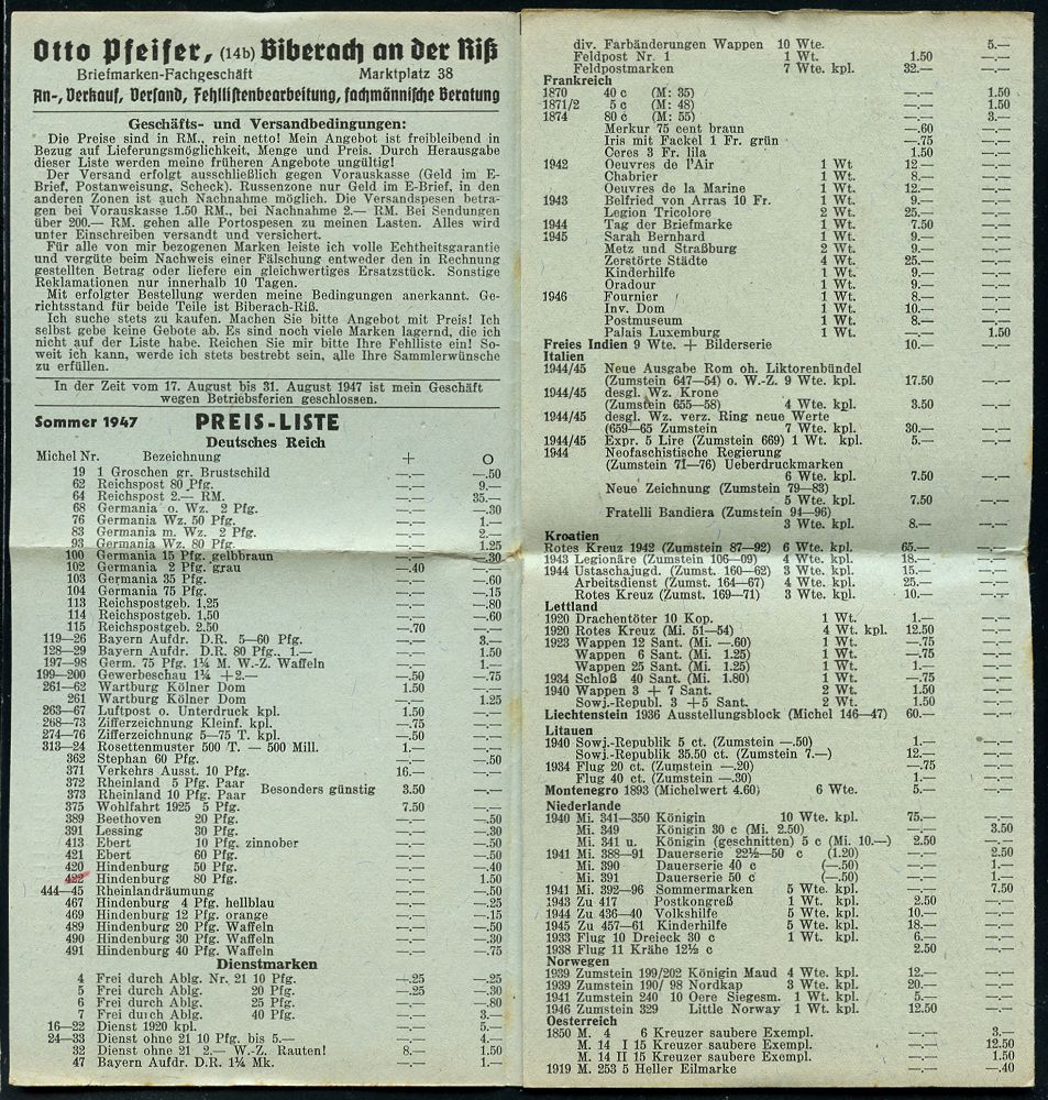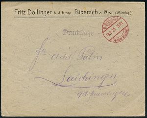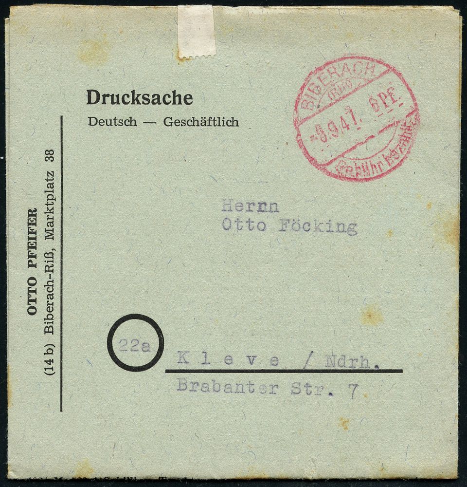 5930 | 14 € | POSTLEITRAUM 7900 (OHNE ULM) : BIBERACH/ (Riß)/ / Gebühr bezahlt 1947 (3.9.) 1K-Brücken-PFS 6 Pf. auf Drs.-Falt-Bf.: OTTO PFEIFFER.. mit Inhalt! (Briefmarken-Fachgeschäft) ausführliche Preisliste n. Kleve (Dü.A-6, Nr.25) | ![]() ![]() ![]() | |