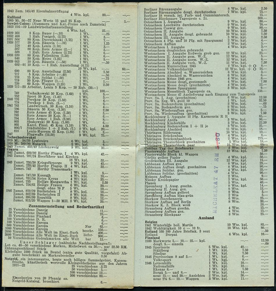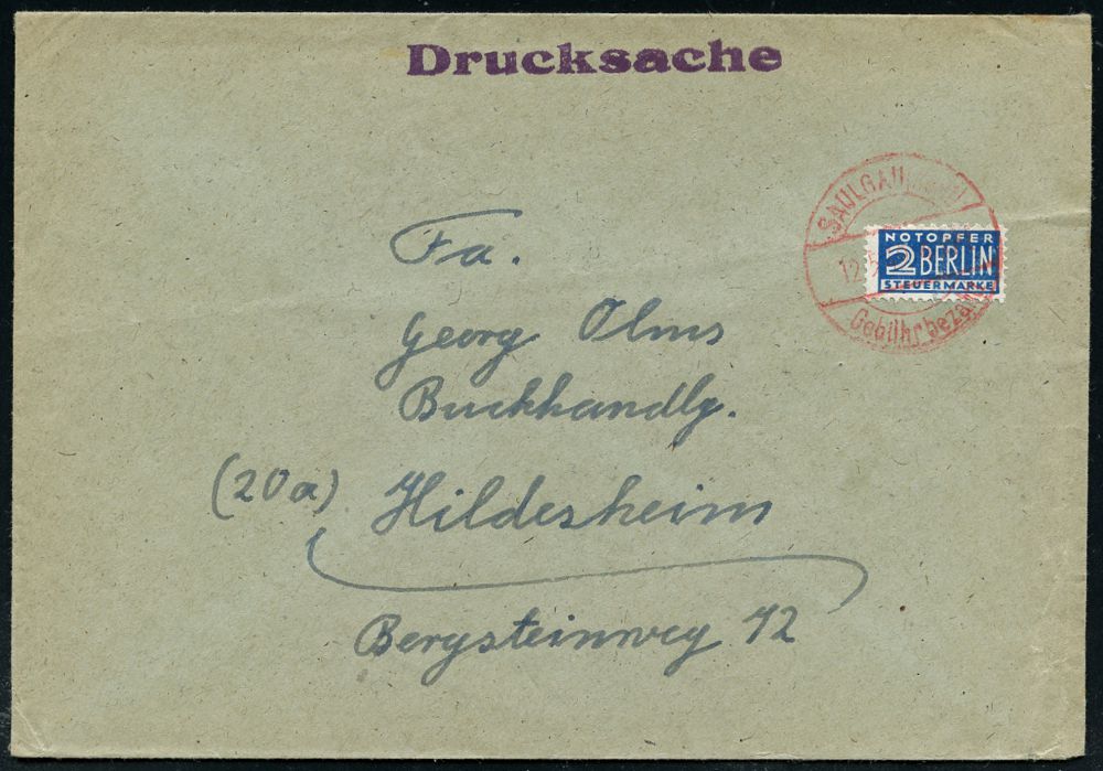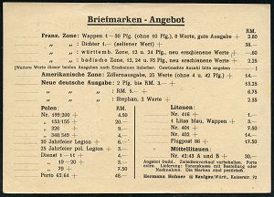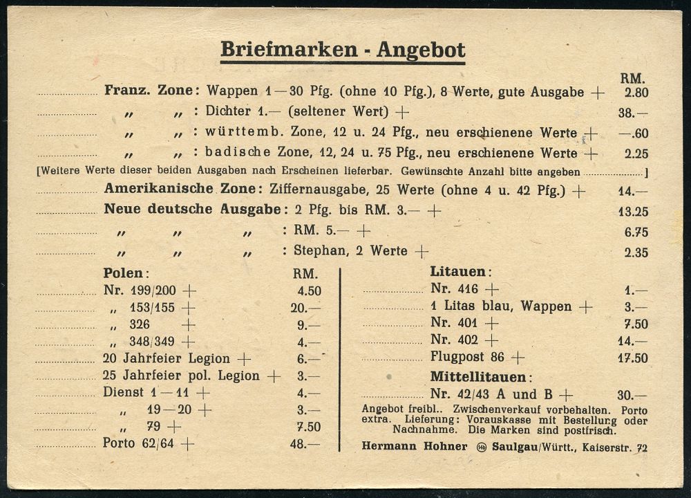 6114 | 12 € | POSTLEITRAUM 7900 (OHNE ULM) : SAULGAU/ Gebühr bezahlt 1947 (8.7.) Doppel-Oval-PFS ohne Wertangabe, ohne Uhrzeit auf Firmen-Kt.: Hermann Hohner.., rs. Briefmarken-Preisliste (Dü.A-5, Nr.20 b) | ![]() ![]() | |