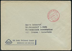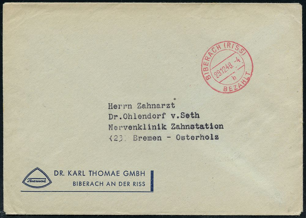 5931 | 10 € | POSTLEITRAUM 7900 (OHNE ULM) : BIBERACH (RISS)/ b/ BEZAHLT 1948 (29.12.) 2K-Steg-PFS ohne Wertangabe mit Uhrzeit auf Firmen-Bf.: Dr. KARL THOMAE GMBH mit Firmen-Logo = Pharma-Hersteller, vergl. Kat.-Nr. (Dü.A-7, Nr.32 b) | ![]() | |