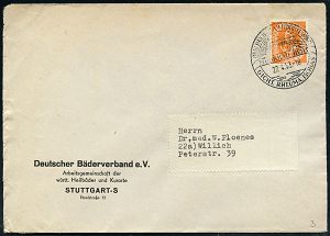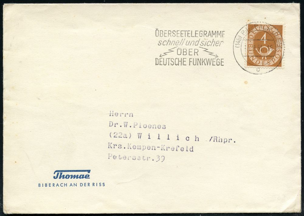 5936 | 16 € | POSTLEITRAUM 7900 (OHNE ULM) : (14b) BIBERACH (RISS)/ o/ ÜBERSEETELEGRAMME/ schnell u.sicher/ ÜBER/ DEUTSCHE KABELWEGE 1951 (16.9.) seltener MWSt (2 Blitze) Firmen-Bf.: Thoemae.. = Pharma-Hersteller (Bo.S 563 A , nur 2 1/2 Jahre verwendet) | ![]() | |